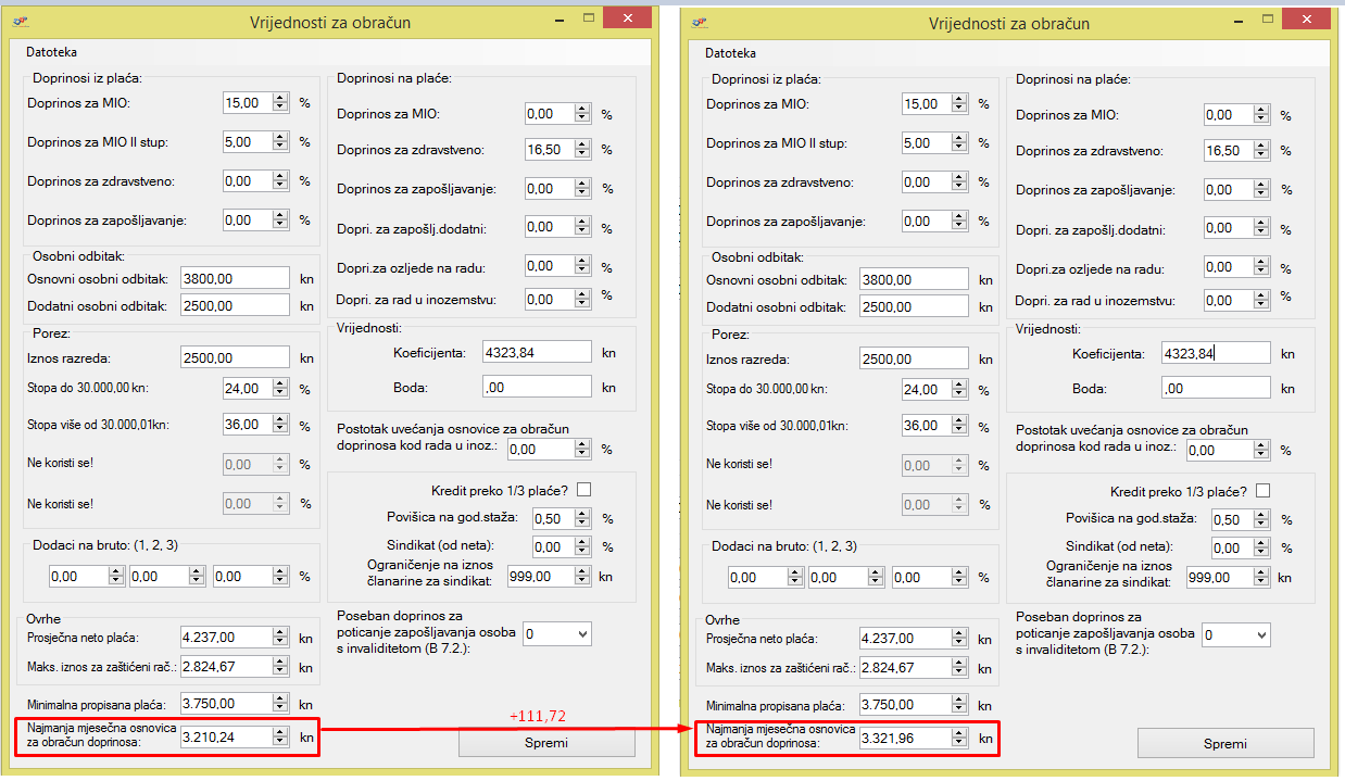 Ovu vrijednost možete promijeniti u izborniku Temeljni podaci -> Vrijednosti za obračun na način da promijenite vrijednost najmanje mjesečne osnovice za obračun doprinosa (primjer je prikazan na slici ispod).