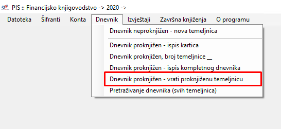 Dodana je mogućnost vraćanja temeljnice koja je već proknjižena u programu, a pokreće se klikom na izbornik Dnevnik -> Dnevnik proknjižen - vrati proknjiženu temeljnicu (slika ispod). Ova opcija koristi se u slučaju da je na proknjiženoj temeljnici potrebno promijeniti neki od podataka za koji ne želite imati pisani trag o promijeni (storno) već samo napraviti ispravak.