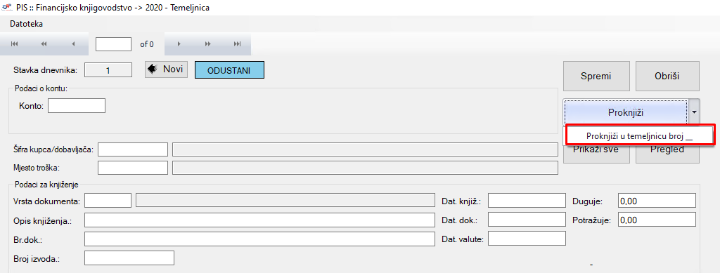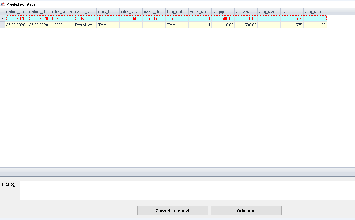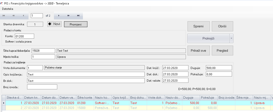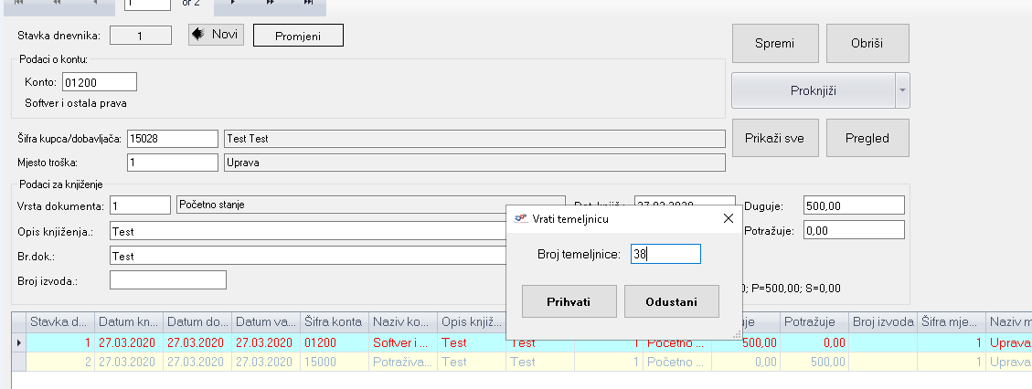 U ovom prozoru moguće je promijeniti bilo koji podatak vezan za te stavke, dodati nove stavke ili obrisati postojeće ali pod uvjetom da saldo temeljnice, prije ponovnog knjiženja, bude 0,00, odnosno da prema pravilu dvojnog knjigovodstva dugovna strana bude jednaka potražnoj.