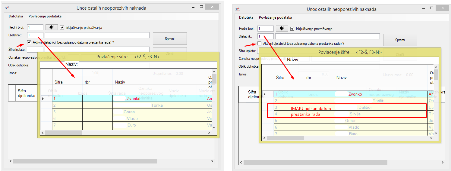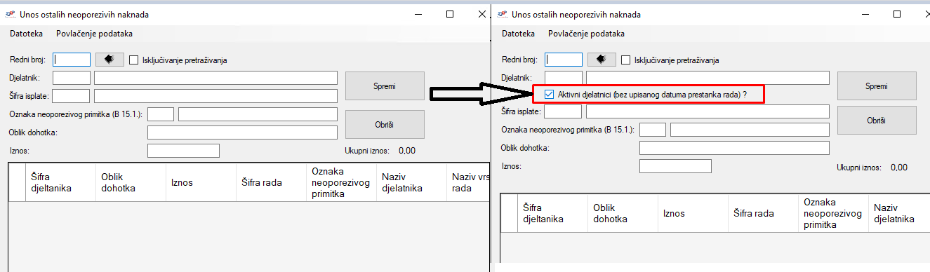 Kod unosa ostalih neoporezivih naknada dodana je opcija koja omogućuje prikaz izbornika samo aktivnih djelatnika (bez datuma prestanka rada) ili svih djelatnika koji su upisani u programu u izborniku Temeljni podaci - Djelatnici.