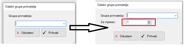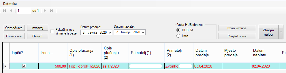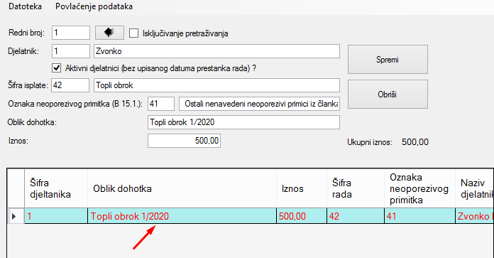 Kod povlačenja podataka za koje je kreirana grupa primatelja dodana je mogućnost odabira mjeseca za koji se isplaćuju neoporezive naknade te se taj podatak dodaje podacima koji su upisani u polje Oblik dohotka. U ovom primjeru je vidljivo da se isplata odnosi na 1. mjesec u 2020. godini (1/2020).