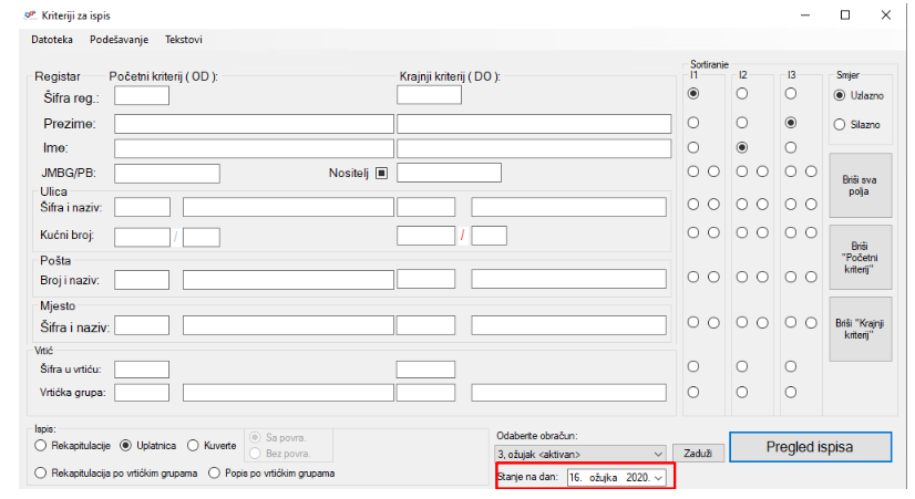 Kod definiranja kriterija za ispis, važno je u polju Stanje duga na dan odabrati datum kako bi program znao sa kojim datumom je potrebno ispisati iznos salda na uplatnici ispod redovnog iznosa.