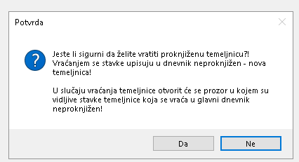 Upisom razloga vraćanja te klikom na Zatvori i nastavi program još jednom traži potvrdu vraćanja temeljnice. Potvrdnim odgovorom prethodno proknjižena temeljnica vraća se i pojavljuje u izborniku Dnevnik- > Dnevnik neproknjižen - Nova temeljnica.