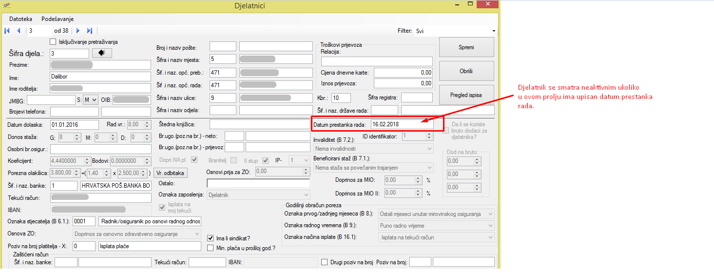Ukoliko je opcija označena kvačicom (kao na slici ispod) kod odabira djelatnika prikazuju se samo djelatnici koji u izborniku Temeljni podaci - Djelatnici nemaju upisan datum prestanka rada, u suprotnome (bez kvačice kod te opcije) se prikazuju svi djelatnici, kao i do sada.