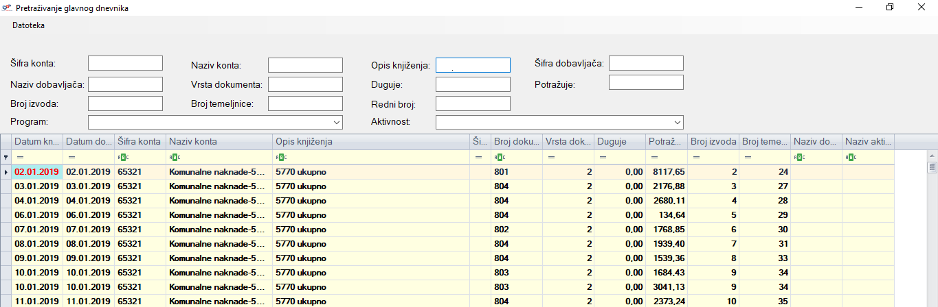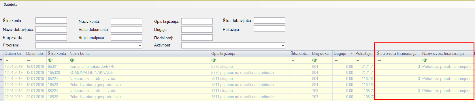 U izborniku Glavni dnevnik (knjiga) - Pretraživanje glavnog dnevnika - svih temeljnica dodani su stupci u kojima je prikazana šifra i naziv izvora financiranja što do sada nije bilo vidljivo.