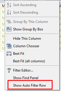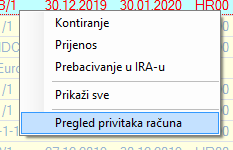 Kod kreiranja datoteke za banku za plaćanje Ulaznih računa ( Pregled-> opcija Virmani - Datoteka) u prozoru koji se otvori klikom na gumb Pregled ispisa omogućeno je filtriranje podataka prema bilo kojem od upisanih podataka (npr. prezimenu, imenu, ulici itd.) koji se nalaze u tablici. Kako bi uključili filter potrebno je kliknuti desnim klikom miša na zaglavlje tablice te odabrati opciju Show Auto Filter Row te se tada pojavljuje redak kao na slici ispod u koji je potrebno upisati dio podatka ili cijeli podatak koji je potrebno pretražiti.