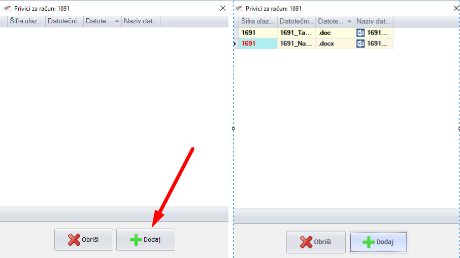 Kako bi dodali privitak potrebno je odabrati račun te desnim klikom miša pokrenuti izbornik, u njemu odabrati opciju Pregled privitaka računa nakon čega se otvori prozor sa slike ispod u kojem pomoću opcije Dodaj, odabiremo postojeći dokument te ga prilažemo računu.