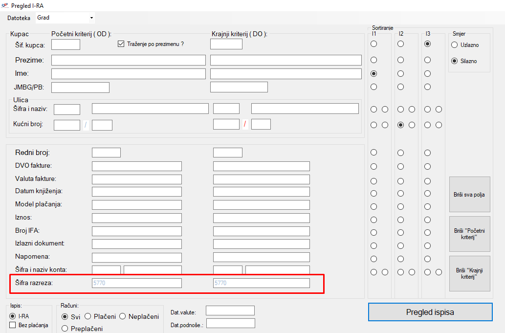 Kod ispisa Izlaznih računa dodana je mogućnost pretraživanja po šifri razreza. npr. ako upišemo šifru 5770 (šifra Komunalne naknade) ispisat će nam se svi računi samo iz tog razreza, odnosno oni vezani za komunalnu nakandu.