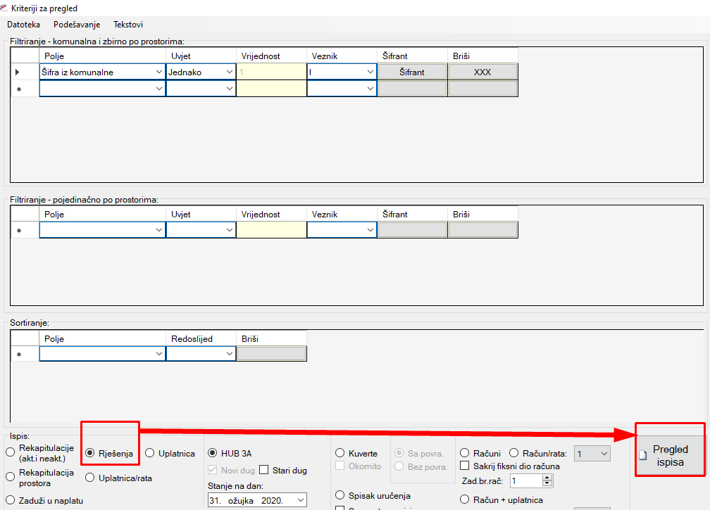 Klikom na gumb Pregled ispisa otvara se prozor kao na slici ispod u kojem je potrebno postaviti kriterije prema kojima će program ispisati dokumente (rješenje, račun, uplatnica, kuverte) i napraviti zaduživanje u naplatu.