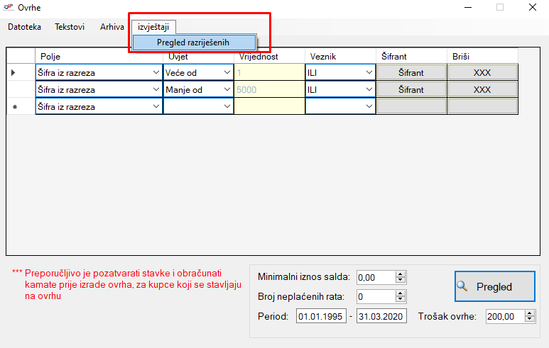Postavljanjem kriterija te klikom na gumb Pregled otvara se prozor kao na slici ispod u kojem je potrebno postaviti kriterije prema kojima će program ispisati opomene. Klikom na gumb Pregled otvara se prozor koji je također prikazan na slici ispod u kojem je potrebno izabrati jednu od ponuđenih opcija te u sljedećem koraku podesiti podatke koji će kreirati klasu i urbroj traženih opomena.