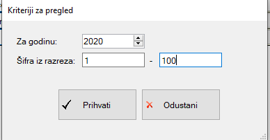Klikom na tu opciju otvara se prozor sa slike ispod u kojem je potrebno odabrati godinu na koju se odnose ovrhe koje je potrebno pregledati te šifru iz razreza ili raspon od - do šifri iz razreza.