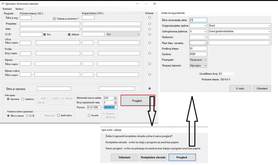 Naglašavamo da je najvažnija razlika između opcija Pregled i Kompletna obrada u tome što se opcija Pregled može koristiti nebrojeno puta te će svaki put kreirati jednak redni broj klase u istoj klasifikacijskoj oznaci te opomena neće automatski biti urudžbirana u programu Ured Bez Papira, dok opcija Kompletna obrada AUTOMATSKI URUDŽBIRA opomenu te ju, zajedno sa dokumentom u .pdf formatu, šalje u program Ured Bez Papira gdje svako zauzima svoj rbr klase te ga program više nikako ne možete dobiti kod izrade opomena.
