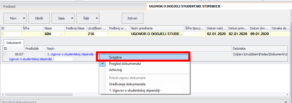 Desnim klikom miša na kartici Dokumenti određenog predmeta, odaberu se Svojstva i pritom se otvori novi prozor na kojem se nalazi kartica Prilozi.