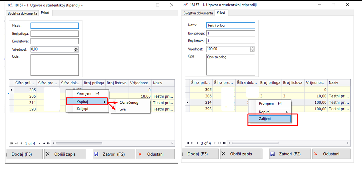 Također, priloge možemo kopirati i premjestiti u dokument unutar istog predmeta ili u neki skroz drugi predmet, i to pojedinačno ili sve odjednom.