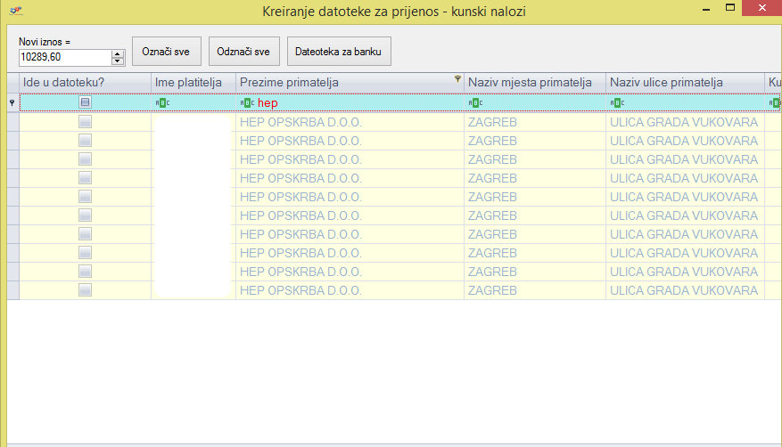 Kako bi označili filtrirane podatke, a za koje je potrebno kreirati datoteku za banku, potrebno je kliknuti gumb Označi sve (označava sve koji su prikazani u tablici ispod) ili svakog pojedinačno označiti klikom na polje Ide u datoteku? te pritiskom tipke Space (razmak) na tipkovnici.