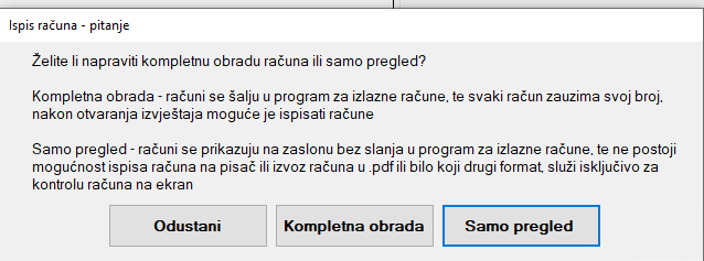 Naglašavamo da je najvažnija razlika između opcija Samo pregled i Kompletna obrada u tome što se opcija Samo pregled može koristiti nebrojeno puta te će svaki put kreirati jednak redni broj klase u istoj klasifikacijskoj oznaci te rješenje neće atomatski biti urudžbirano u programu Ured Bez Papira, dok opcija Kompletna obrada AUTOMATSKI URUDŽBIRA rješenje te ga, zajedno sa dokumentom u .pdf formatu, šalje u program Ured Bez Papira gdje svako zauzima svoj rbr klase te ga program više nikako ne možete dobiti kod izrade rješenja Komunalne naknade.