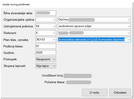 Kompletna obrada- klikom na ovu opciju također se otvara prozor sa slike ispod u kojem je potrebno odabrati podatke koji će kreirati klasu i urbroj tog rješenja, biti će ispisani na njemu ali će se za njih automatski u programu Ured Bez Papira otvoriti predmet sa navedenom klasom koja je u tom prozoru prethodno podešena i prvim sljedećim praznim rednim brojem klase iz programa Ured Bez Papira.