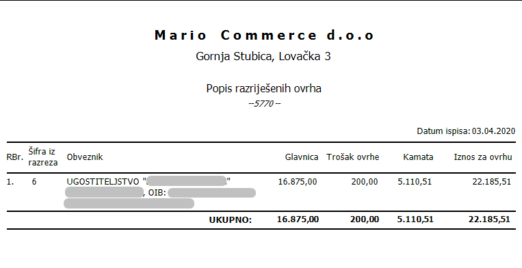 Odabirom kriterija te klikom na Prihvati otvara se prozor kao na slici ispod u kojem se pojavljuju podaci o traženim ovrhama. U ovom primjeru je vidljivo da prema zadanim kriterijima postoji samo jedna poslana ovrha te se za nju ispisuju podaci, zajedno sa ukupnim zbrojem po svakom od stupaca na dnu.
