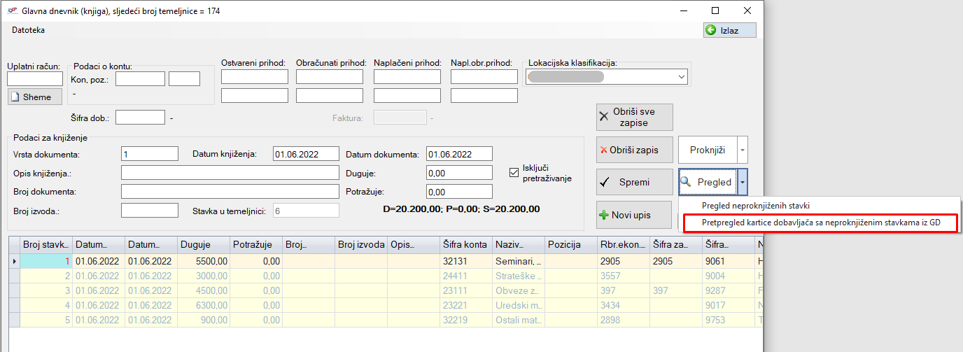 Kod upisa nove temeljnice u Glavni dnevnik (knjiga) dodana je mogućnost pretpregleda neproknjiženih stavka na karticama dobavljača. Klikom na opciju Pregled otvara se mogućnost Pregleda neproknjiženih stavki te Pretpregled kartice dobavljača s neproknjiženim stavkama iz GD.