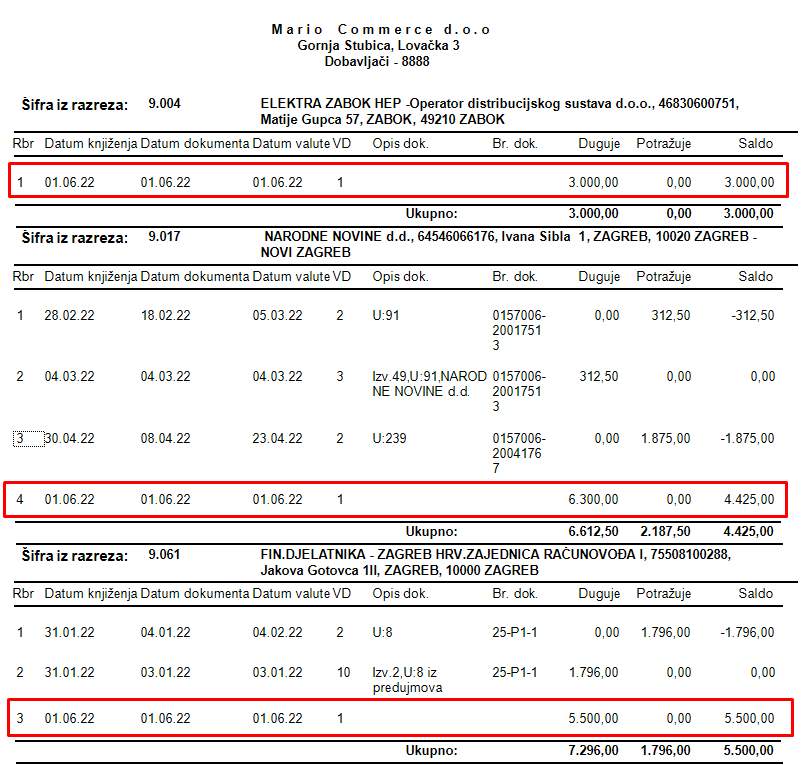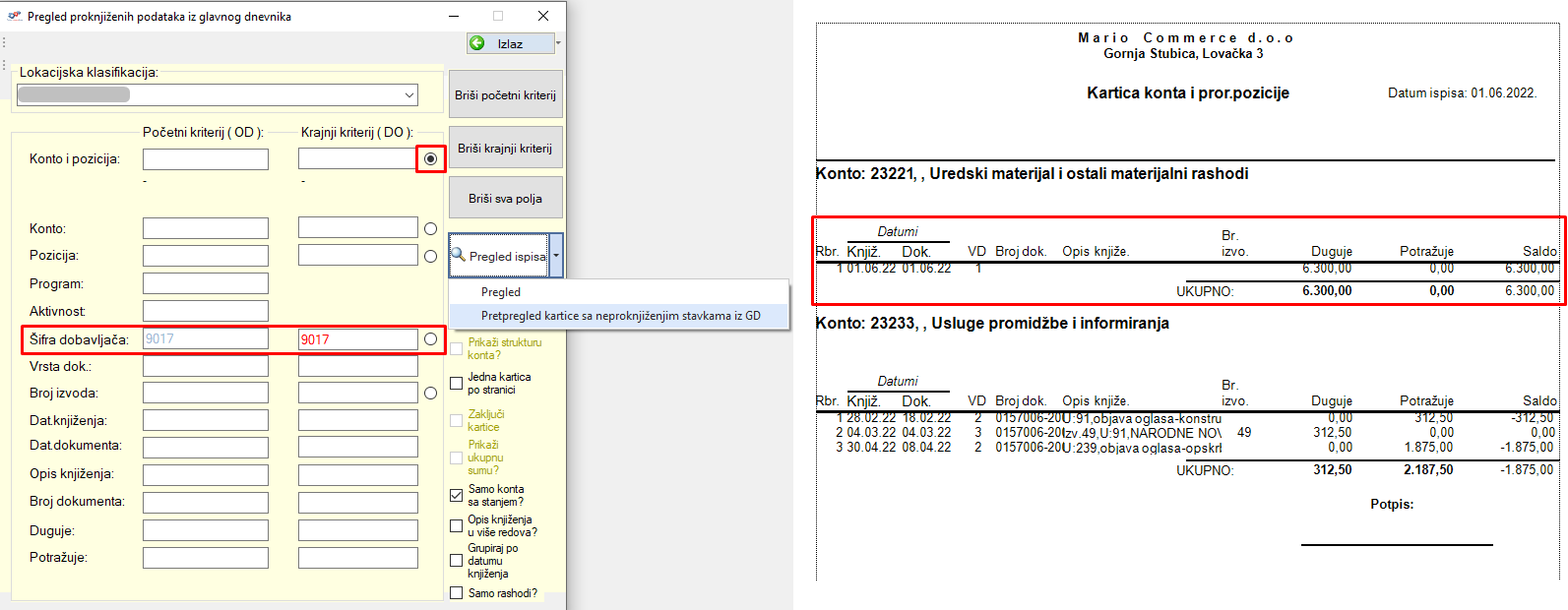 Klikom na opciju Pretpregled kartice dobavljača s neproknjiženim stavkama iz GD otvara se kartica dobavljača s proknjiženim i neproknjiženim stavkama zajedno što omogućuje da se prije knjiženja samog dnevnika vidi kako će kartica dobavljača izgledati nakon što se Glavni dnevnik proknjiži.