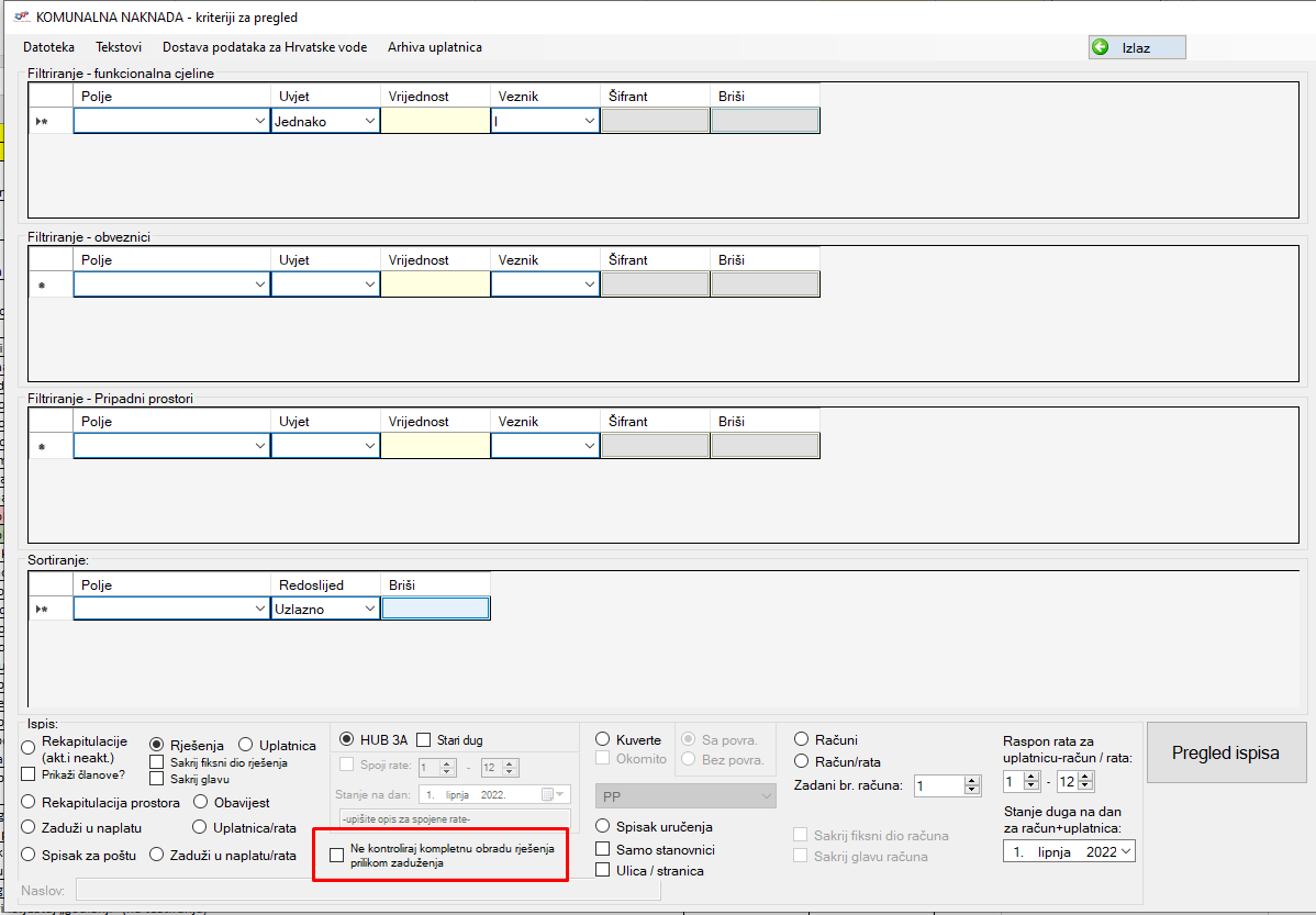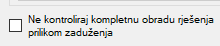 - Dodana opcija Ne kontroliraj kompletnu obradu rješenja prilikom zaduženja kod ispisa rješenja i zaduživanja KN