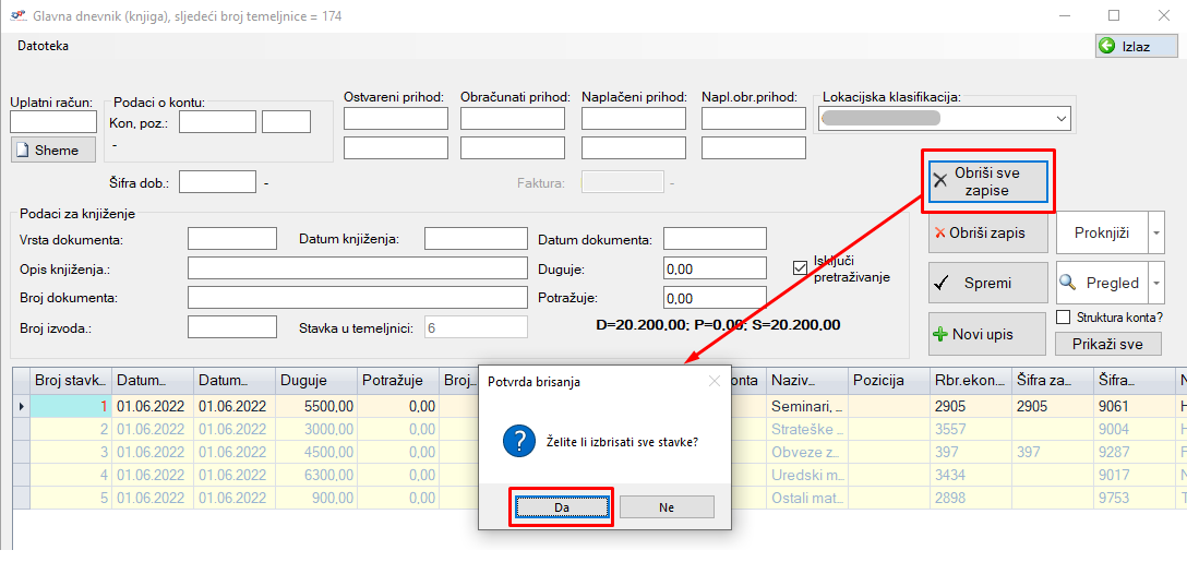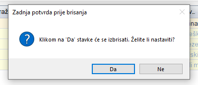 Klikom na Da još jednom se za provjeru pojavljuje prozorčić s pitanjem Želite li nastaviti?. Klikom na Da brišu se svi upisani zapisi u glavnom dnevniku.