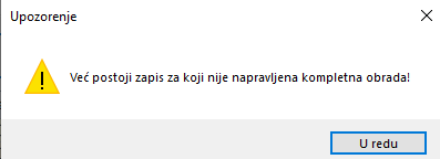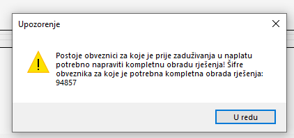 program će javiti upozorenje sa slike ispod te ga neće zadužiti. Kako bi se navedeno zaduženje moglo napraviti potrebno je napraviti kompletnu obradu rješenja ili aktivirati opciju na način da ju označite kvačicom.