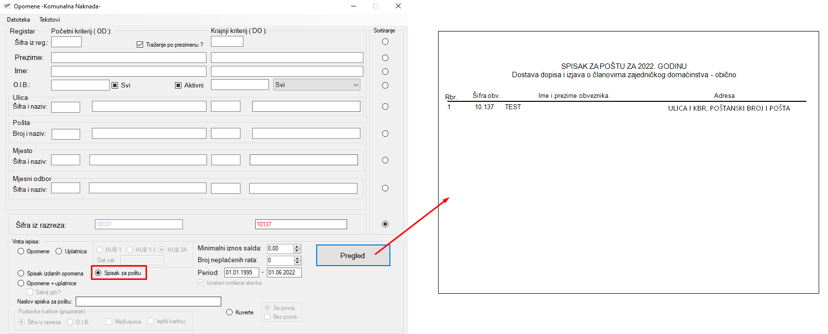 Na opomenama je dodana opcija(slika ispod) koja omogućava ispis Spiska za poštu za opomene koje su kreirane i koje se šalju iz programa. Kod ispisa spiska za poštu potrebno je zadati jednake kriterije koji su bili zadani i kod kreiranja opomena kako bi lista bila ispravna.