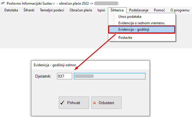 Uz Evidenciju o radnom vremenu na mjesečnoj bazi, sada je dostupan i Izvještaj o evidenciji godišnjeg odmora za svakog pojedinog djelatnika. Klikom na opciju Evidencija - godišnji u padajućem izborniku Šihterice, otvara se prozor za odabir djelatnika za kojeg se želi pogledati izvještaj.