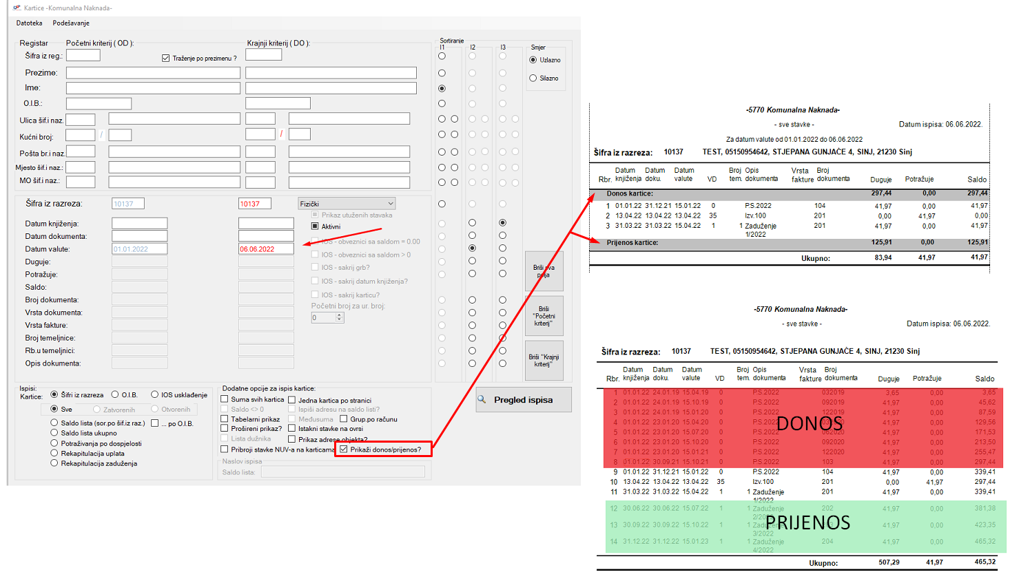 U izborniku Kartice dodana je opcija koja omogućava ispis donosa/prijenosa iznosa gdje iznos donosa sadržava zbroj dugovne strane, potražne strane i salda prije datuma koji je upisan u kolonu OD, a prijenos sadržava zbroj dugovne strane, potražne strane i salda nakon datuma koji je upisan u kolonu DO. Drugim riječima, ukoliko je potrebno vidjeti iznos OD 01.01.2022 DO 06.06.2022 tada bi DONOS bio zbroj iznosa sve prije - 01.01.2022, a PRIJENOS nakon 06.06.2022 - kao što je vidljivo na slici ispod. Filtrirati se može po datumu knjiženja, dokumenta ili valute, kao što je u primjeru ispod.