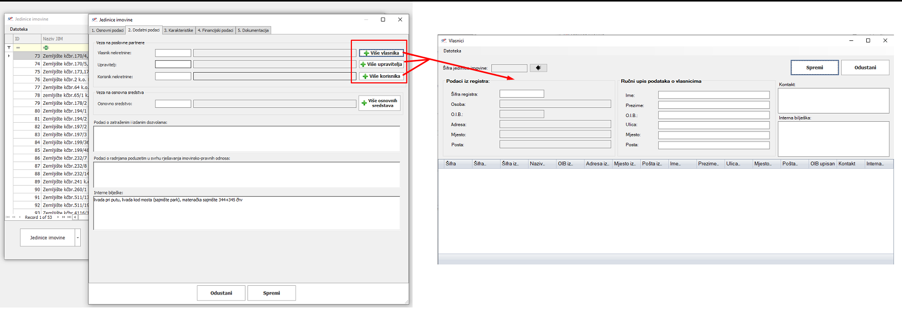 - Dodana je mogućnost unosa više upravitelja, vlasnika i korisnika nekretnine na jedinicu imovine