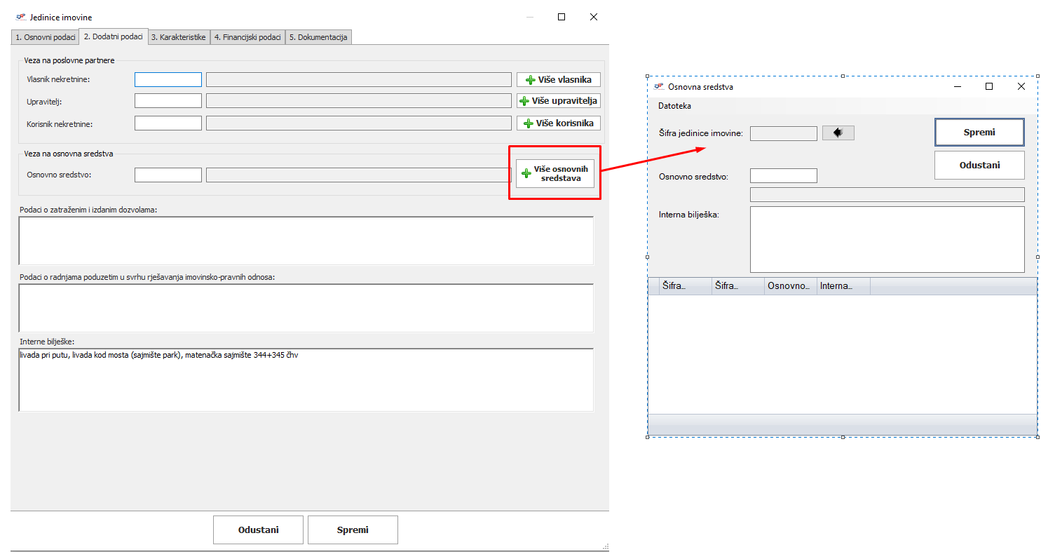 Kod dodavanja/uređivanja jedinice imovine dodana je mogućnost pridruživanja više od jednog osnovnog sredstva, naravno preduvjet je da je osnovno sredstvo prethodno upisano u program Osnovna sredstva. Upisani podatak također će biti vidljiv i na ispisu JIM.