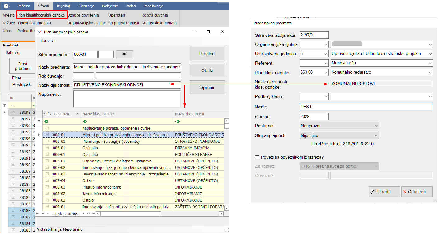 Dodana je mogućnost upisa naziva djelatnosti klasifikacijske oznake u plan klasifikacijskih oznaka kako bi kasnije ta djelatnost bila vidljiva prilikom otvaranja predmeta.
