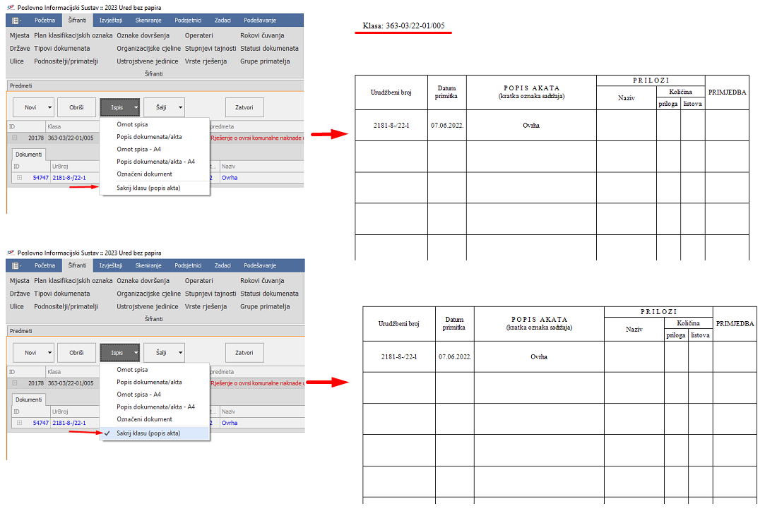 Dodana je opcija koja omogućava ispis izvještaja Popis dokumenata/akata bez prikazane klase u gornjem desnom uglu. Ispis se kontolira pomoću opcije Ispis -> Sakrij klasu (popis akata) kao što je vidljivo na slici ispod. Kada je opcija označena kvačicom klasa neće biti ispisana na popisu akata, a kada nema kvačice onda bude.