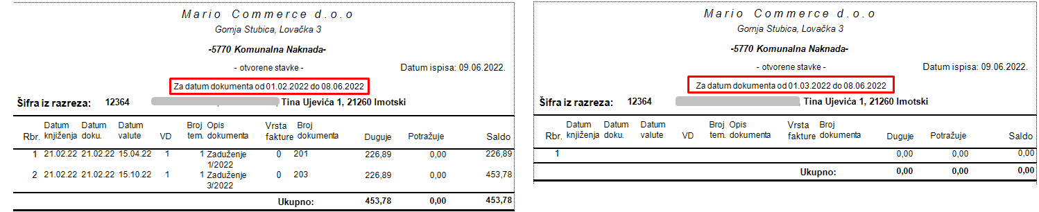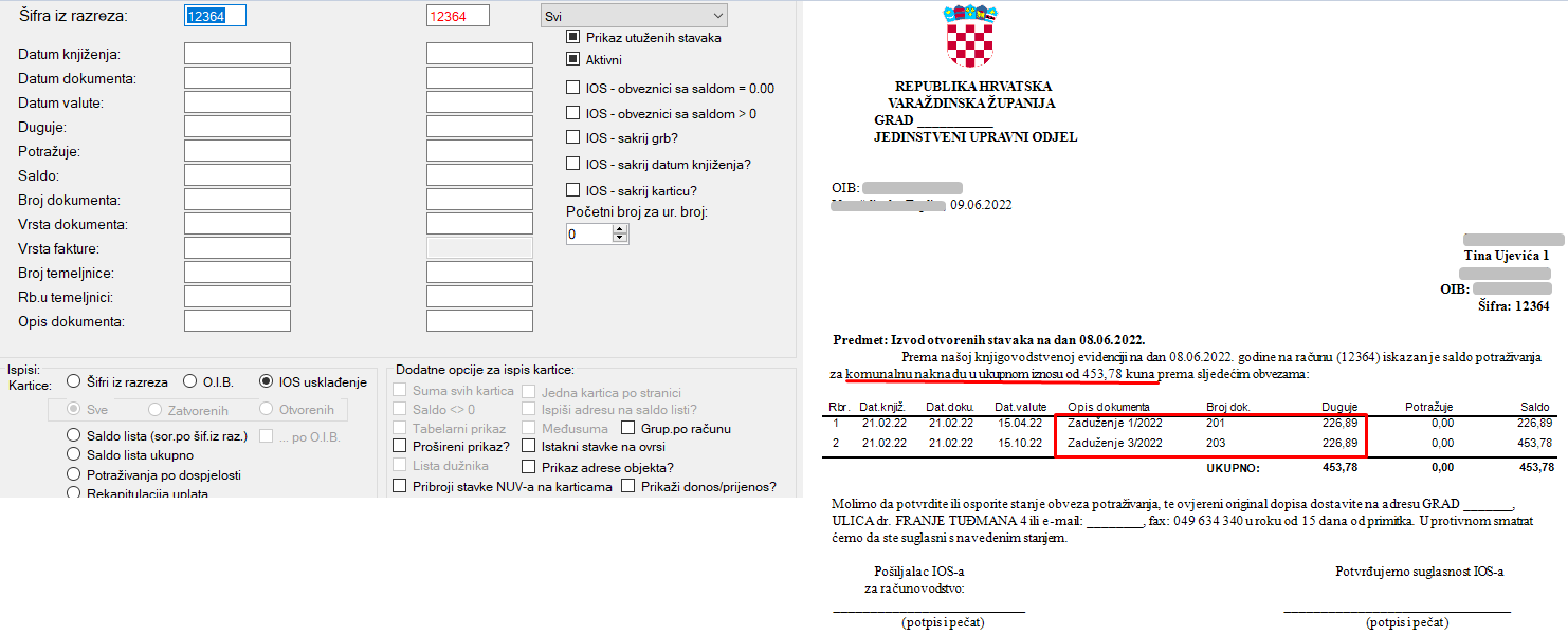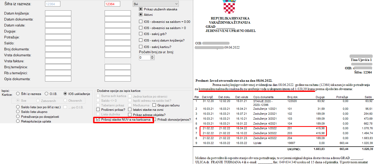 U prikazu IOS usklađenja moguće je ispisati zajednički IOS za komunalnu naknadu i naknadu za uređenje voda te će nam sve stavke biti prikazane u zbirnom iznosu. Potrebno je samo prilikom ispisa označiti opciju Pribroji stavke NUV-a na karticama. Na slikama ispod prikazan je IOS samo za komunalnu, te IOS sad pribrojenim stavkama NUV-a.