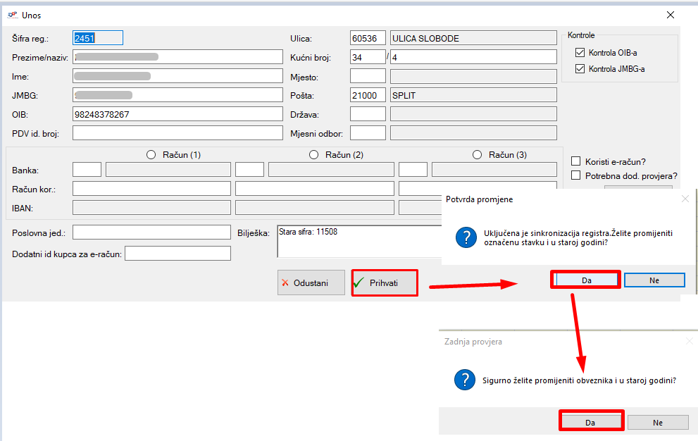Nakon dvostruke potvrdi o promijeni, podaci su sinkronizirani. Ukoliko ne želite da vam program promijeni podatke i u staroj godini, jednostavno na prvoj obavijesti kliknete Ne i promjena će se izvršiti samo u novoj godini.