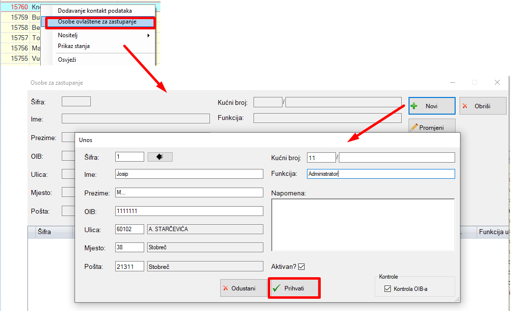 Svakom obvezniku u registru možemo dodati ovlaštenu osobu za zastupanje na način da desnim klikom miša kliknemo na obveznika kojemu želimo dodati ovlaštenu osobu za zastupanje prilikom čega se otvori novi prozor u kojem upisujemo osnovne podatke osobe za za zastupanje. Jedan obveznik može imati više upisanih osoba za zastupanje, a one se ispisuju na rješenju komunalne naknade, o čemu je više rečeno u nadogradnjama za Komunalnu GIS- Ispisivanje ovlaštene osobe za zastupanje.