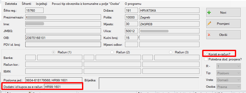 Korisnici koji preko našeg sustava šalju e-račune, mogu u registru upisati dodatni ID obveznika jer ih kod slanja pojedinih e računa sustav osim osnovnog ID-a, traži i dodatni ID, odnosno šifru dodatne organizacijske jedinice unutar neke poslovne jedinice. Na primjer- ukoliko je primatelj npr. Grad Split (poslovna jedinica)- Ured za branitelje (dodatna organizacijska jedinica), onda uz osnovni ID HR99 upišemo i taj dodatni ID 1601 kao što je na slici ispod.