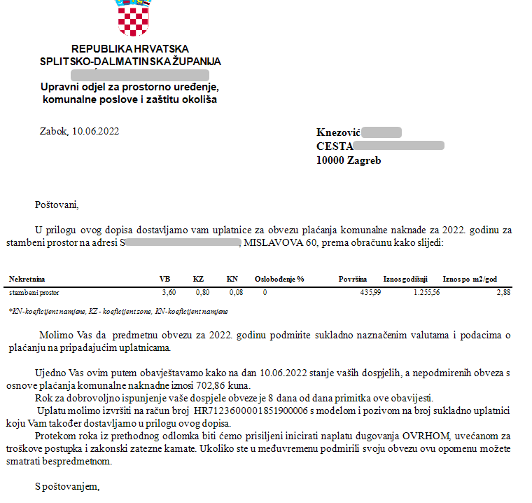 Ova obavijest predviđena je kao svojevrsna opomena za plaćanje nepodmirenih dugovanja koja bi se slala uz uplatnice, a tekst se može prilagoditi po potrebi.