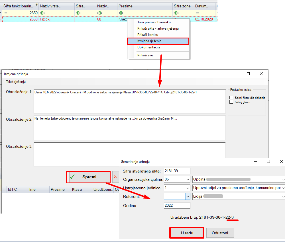 nakon upisivanja teksta kliknuti Spremi prilikom čega se prikažu podaci za generiranje urbroja ukoliko recimo referent koji radi izmjenu nije isti onaj koji je izdao rješenje i slično.