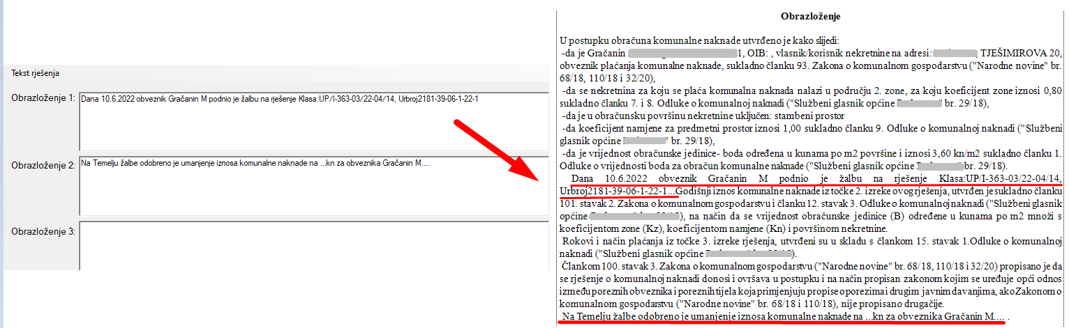 - nakon spremanja, tekst koji smo upisali u polja obrazloženje 1 i 2 vidljiv je na rješenju, na mjestima koja ste predvidjeli za to.