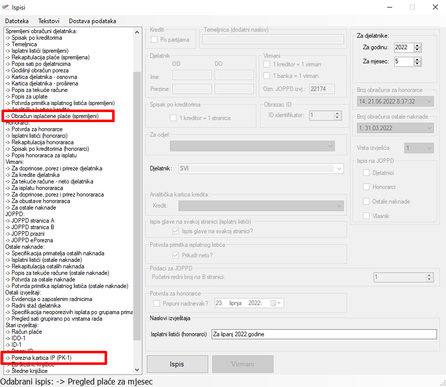- Mogućnost ispisa porezne kartice IP (PK - 1) i Spremljenog obračuna isplaćene plaće za neaktivne djelatnike