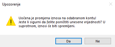 Klikom na Da, promjene iznosa na kontu se ne spremaju te se prelazi na sljedeći konto. Klikom na Ne, promjene iznosa na kontu se automatski spremaju.