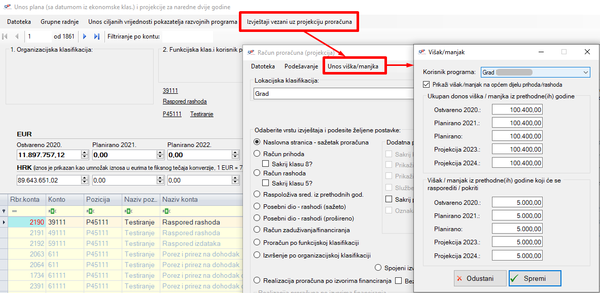 Klikom na Unos plana i projekcije -> Izvještaji vezani uz projekciju proračuna -> Unos viška/manjka otvara se prozor za unos viška/manjka iz prethodne godine te raspored tog viška/manjka.