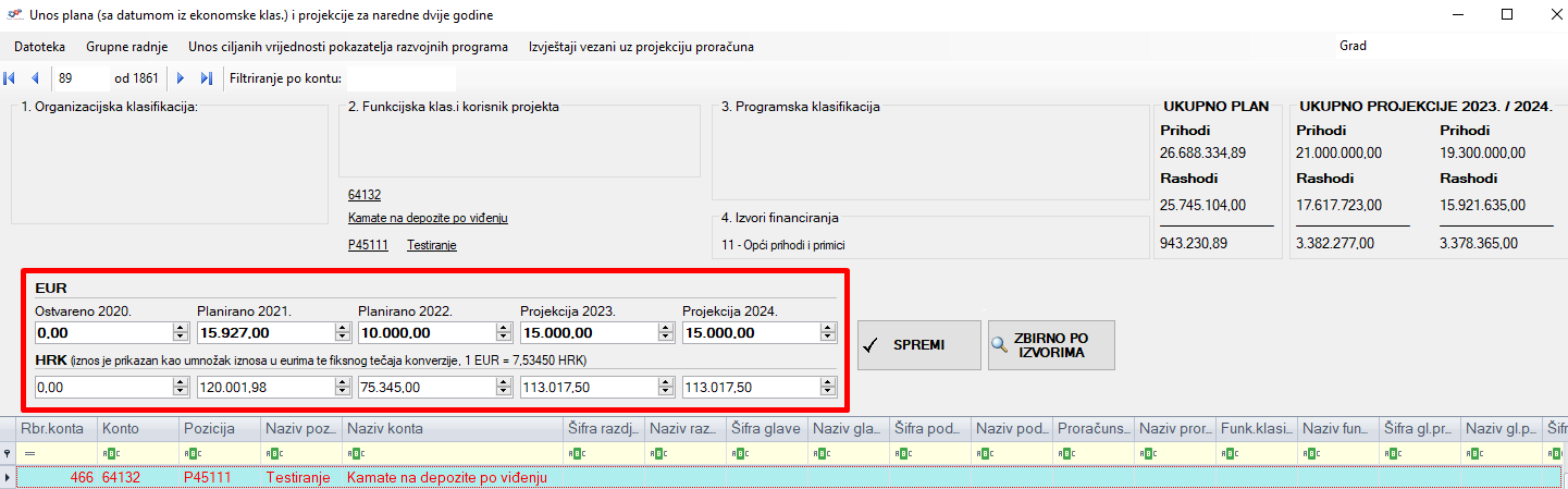 U programu je omogućeno da se iznosi na konta mogu upisivati u eurima i/ili u kunama. Prilikom unosa iznosa u eurima, oni se automatski preračunaju u kune i obratno. Polje s prikazom/unosom iznosa u kunama služi isključivo kao pomoć prilikom izrade plana proračuna, a svi iznosi se spremaju u eurima.