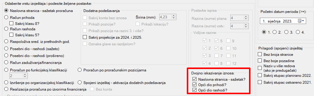 Postoji mogućnost odabira da li želimo da iznosi na Naslovnoj strani te na Računu prihoda i rashoda budu iskazani dvovalutno ili samo u eurima. Ova se mogućnost uključuje/isključuje prije samog otvaranja izvještaja stavljanjem kvačice ispred izvještaja za koji želimo da iznosi budu dvojno iskazani. Prilikom otvaranja bilo kojeg drugog izvještaja (osim navedena tri), ova opcija je zasivljena te se ne može koristiti.