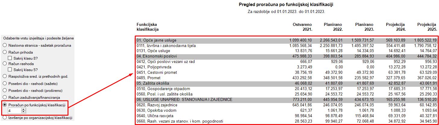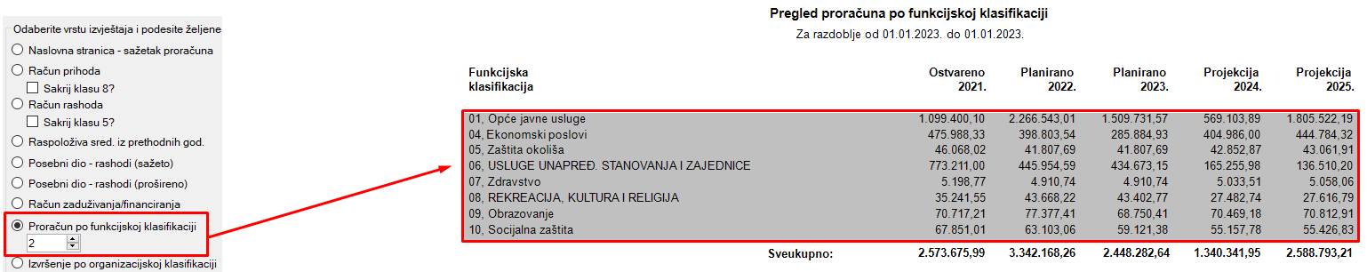 - Prema novoj uredbi, funkcijska klasifikacija se prikazuje na drugoj razini. Na prozoru s popisom izvještaja, stavljeno je polje (ispod naziva izvještaja "Proračun po funkcijskoj klasifikaciji") u kojem se može odrediti na kojoj razini se žele ispisati funkcijske klasifikacije.