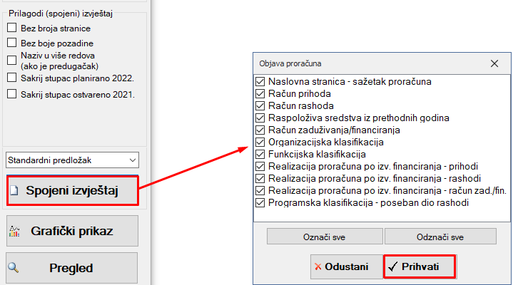 Kako bi se korisnicima olakšao ispis izvještaja, napravljena je opcija koja omogućava prikaz i ispis Spojenog izvještaja. Klikom na opciju Spojeni izvještaj, otvara se prozor za odabir izvještaja koje se želi ispisati/prikazati. Ukoliko je ispred izvještaja stavljena kvačica - taj izvještaj će se ispisati unutar spojenog izvještaja, dok će oni koji nemaju stavljenu kvačicu ispred naziva biti izostavljeni iz tog ispisa.