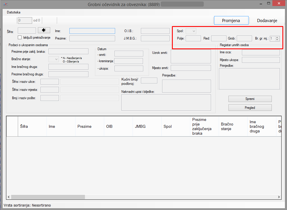 Kod unosa podataka u gorobni očevidnik dodana je mogućnost upisa polja, reda, groba. Omogućeno je da svaku upisanu osobu upiše točno polje, red i broj ukopa. Prikazano na sljedećoj slici