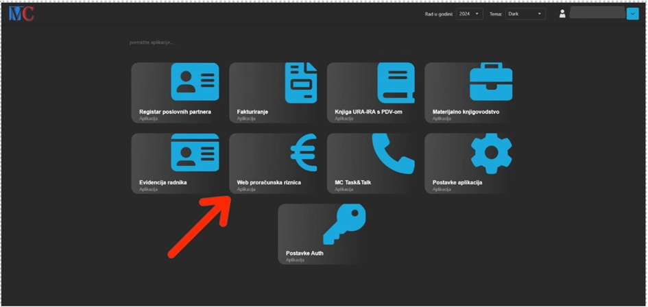 Nakon uspješne prijave u sustav na početnom zaslonu pojavljuje se lista dostupnih aplikacija koje je moguće odabrati ovisno o dodijeljenim ovlastima i dopuštenjima. Za ulazak u web riznicu potrebno je odabrati opciju: „Web proračunska riznica“.